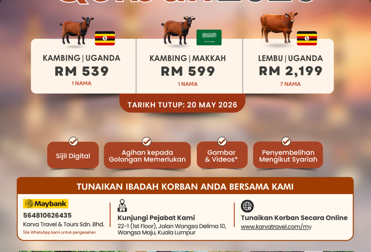 Tunaikan ibadah korban anda dengan mudah dan penuh ketenangan pada Hari Raya Aidiladha ini. Di Karva Travel, kami memastikan ibadah korban dilaksanakan secara bertanggungjawab dan mematuhi garis panduan Syariah β membolehkan anda menyempurnakan ibadah ini walau di mana jua berada. Pilihan Korban: β’ Kambing Uganda RM539 (1 nama)β’ Kambing Makkah RM599 (1 nama)β’ Lembu Uganda […]