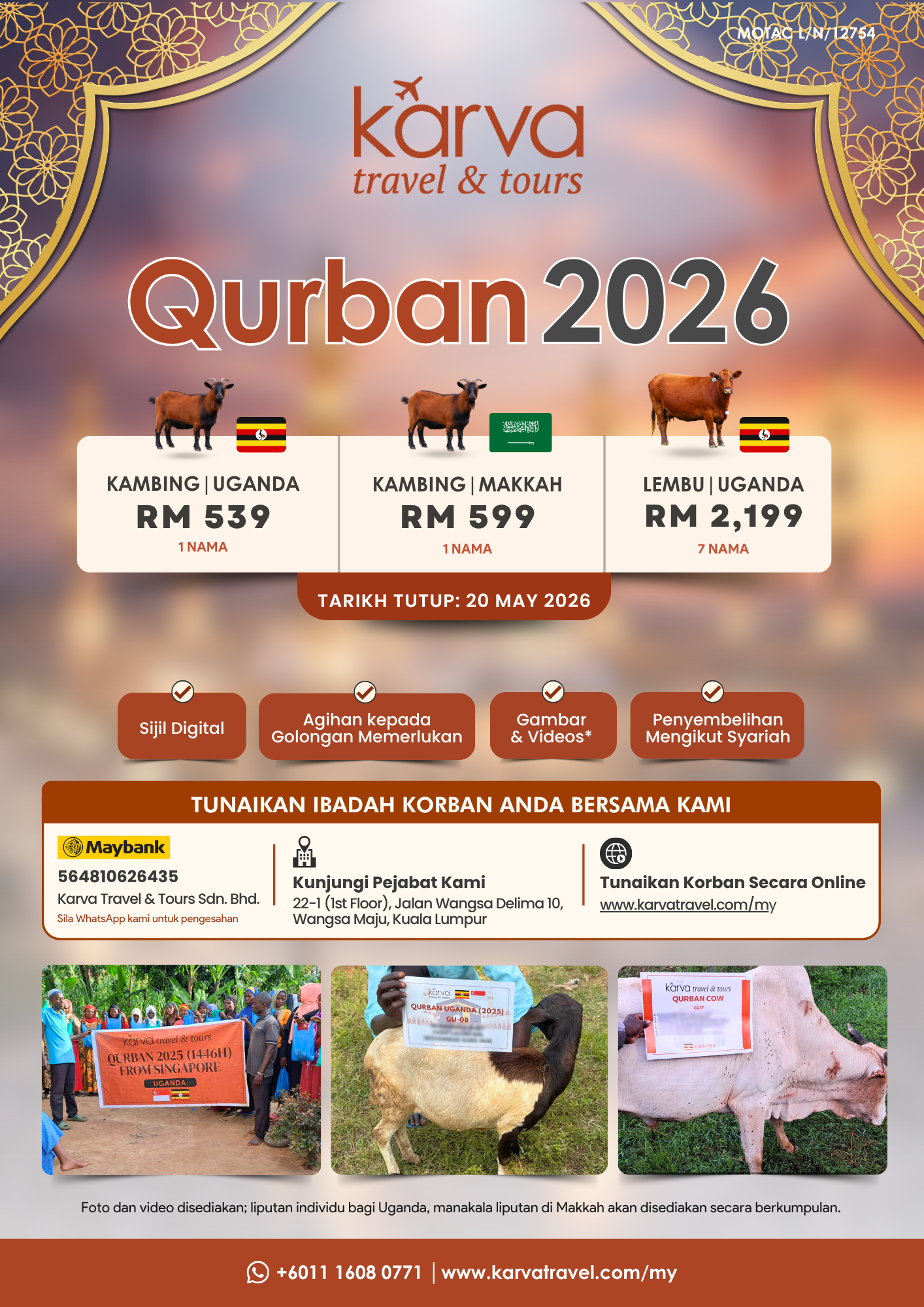 Tunaikan ibadah korban anda dengan mudah dan penuh ketenangan pada Hari Raya Aidiladha ini. Di Karva Travel, kami memastikan ibadah korban dilaksanakan secara bertanggungjawab dan mematuhi garis panduan Syariah — membolehkan anda menyempurnakan ibadah ini walau di mana jua berada.