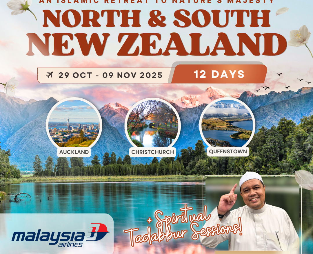 Experience the breathtaking beauty of North & South New Zealand π³πΏ this spring! A journey of reflection, connection, and spiritual renewal. 11 days of scenic landscapes, alpine villages & meaningful moments. π Featuring Tadabbur sessions with Ustaz Zulkiflee Bachik throughout the journey