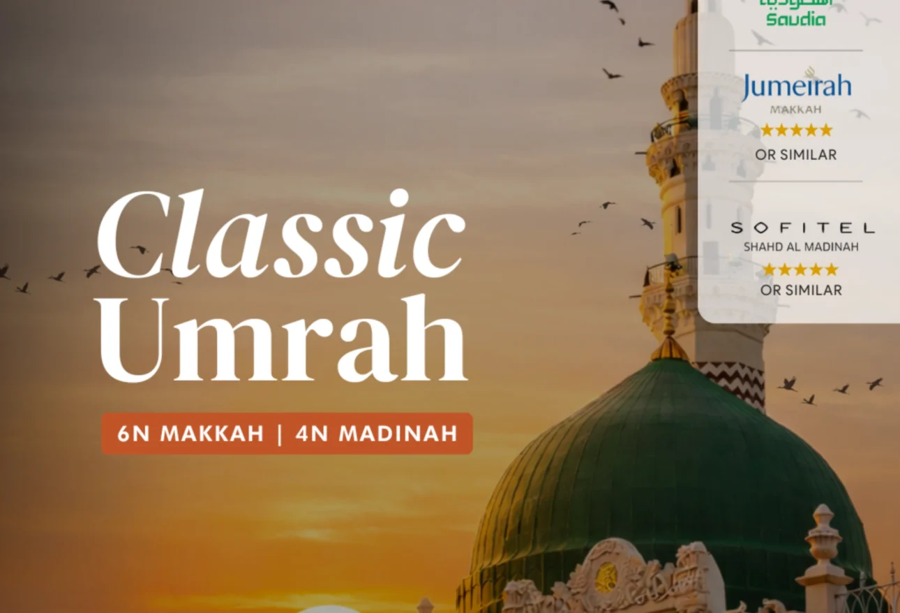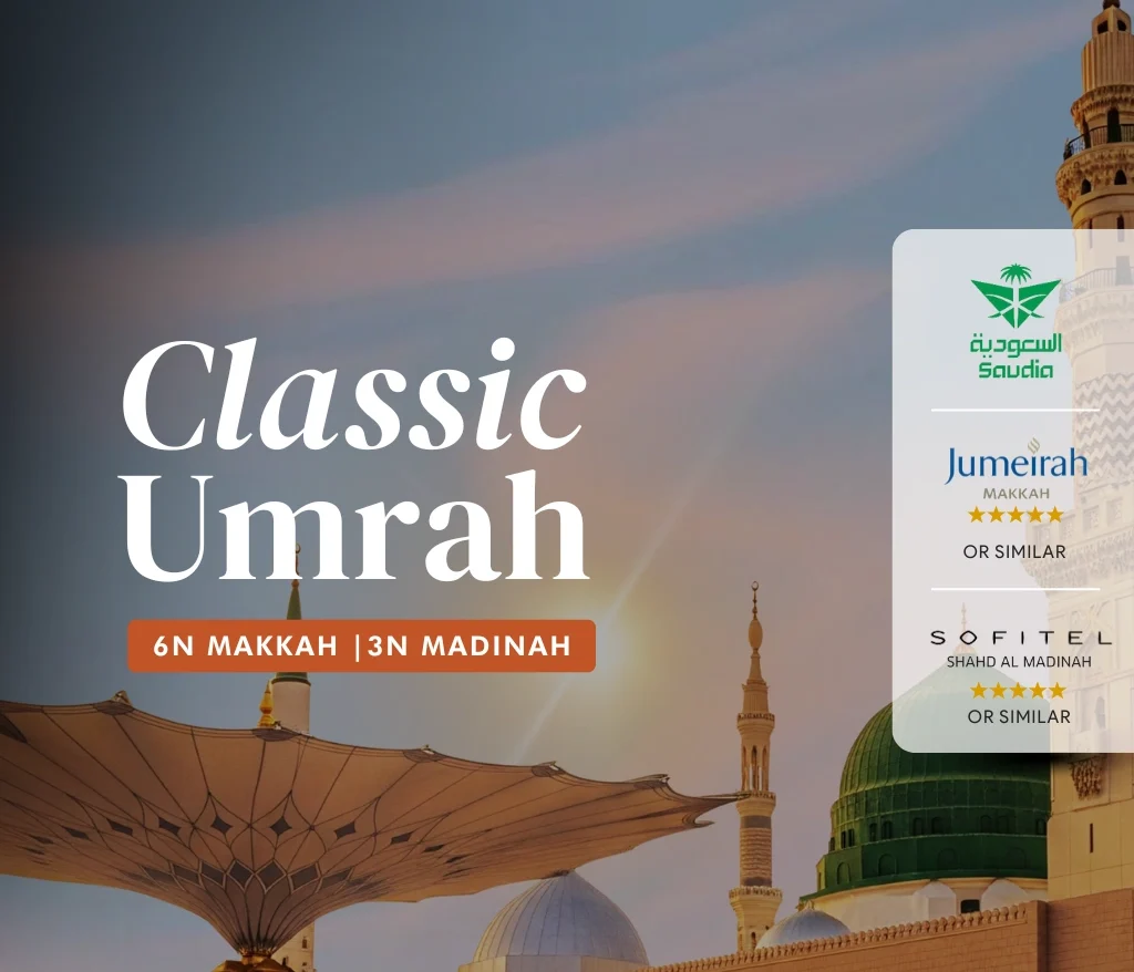Experience a spiritually enriching 11-day journey to the Holy Lands of Makkah and Madinah with our Classic Umrah Package including 1 night at Taif. Designed for comfort and ease, this package includes return flights, quality hotel stays, guided ziarah tours, and full ground arrangements. Ideal for first-timers or anyone seeking a meaningful and well-paced Umrah […]
