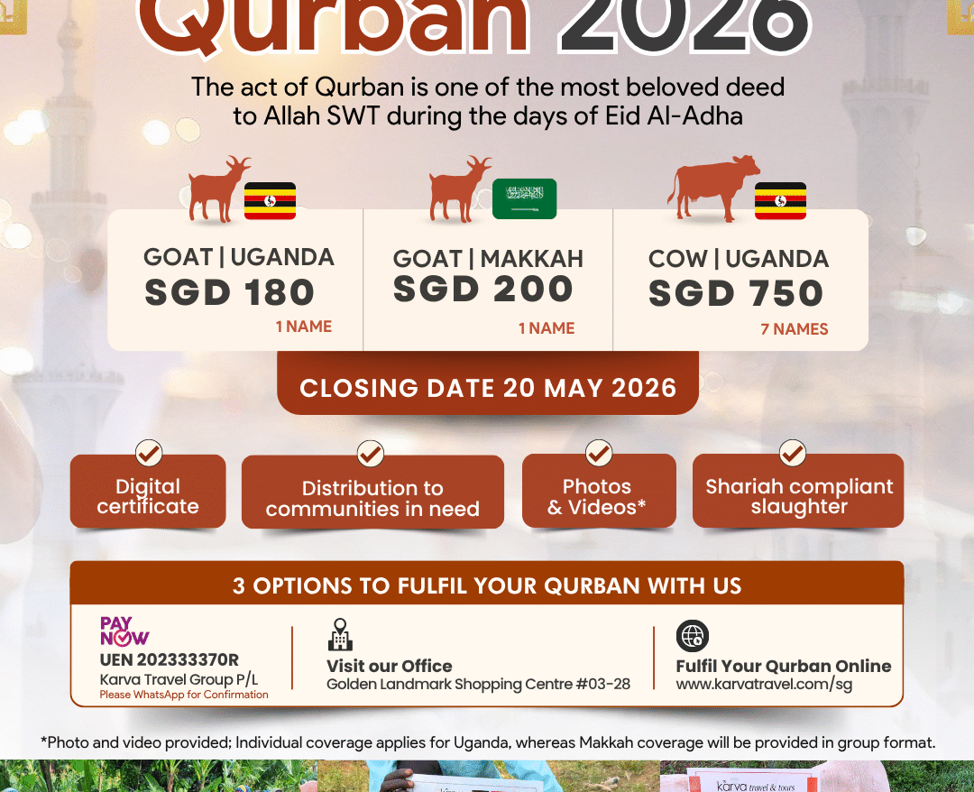 Fulfil your Qurban with ease and peace of mind this Eid Al-Adha. At Karva Travel, we ensure that your Qurban is carried out responsibly and in accordance with Islamic guidelines β allowing you to perform this meaningful act of worship wherever you are. Qurban Options: Goat (Uganda) β SGD 180 (1 name) Goat (Makkah) β […]